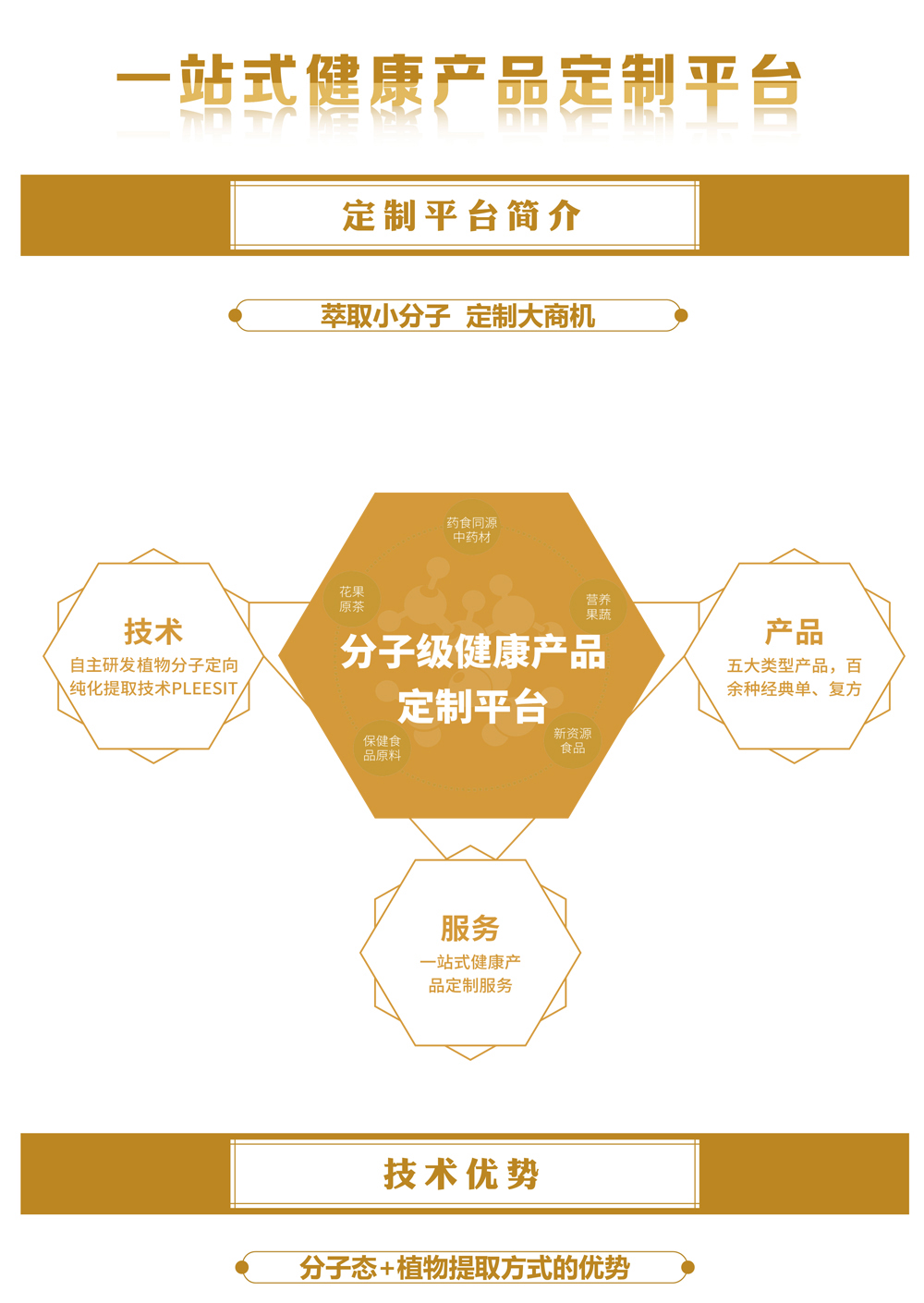 中科分子可提供個(gè)性化分子精華產(chǎn)品OEM/ODM定制生產(chǎn):保健功能食品、藥食同源(中藥材)、新資源食品、營(yíng)養(yǎng)果蔬、花果原茶等五大系列產(chǎn)品,為您精準(zhǔn)匹配市場(chǎng)資源;百余種經(jīng)典單、復(fù)方產(chǎn)品任您選擇,全面覆蓋終端人群。